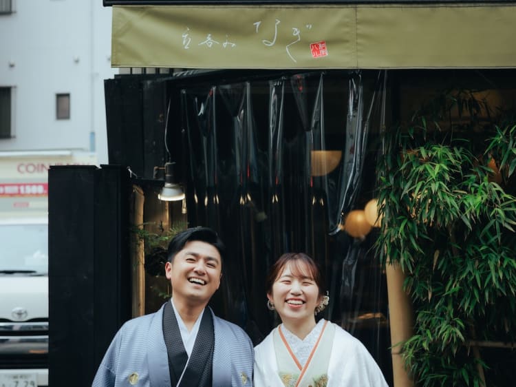 柔らかさを出しつつすっきりまとめたヘアに、ツヤ感あるナチュラルメイクで上品な雰囲気に。次々と出てくる美味しいご飯とお酒を楽しむ表情にシャッターが止まりませんでした。いつもとちょっと違う特別なおふたりが「いつもの!」と注文するところと、ふたりを見るマスターの笑顔が印象的でした。