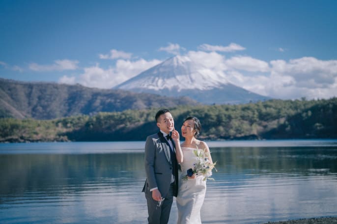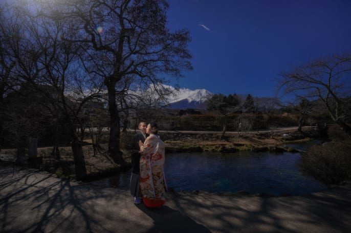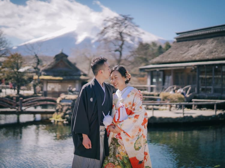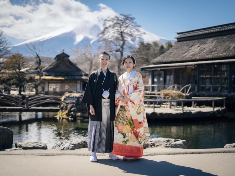 天気が良く富士山もしっかり見える 好コンディションの中で、 日本ならではの結婚写真が実現。