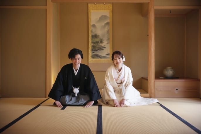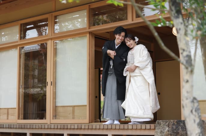 衣装は白無垢に小物で色を加え、色づいた紅葉の中でよく映えるコーディネートに。瑜伽山園地では途中、管理人さんがおふたりのために紅葉で大きなハートを作ってくださり、その時の嬉しそうな姿が印象的でした。季節・風景すべてが完璧な一日で、スタッフも一緒に楽しませていただきました。
