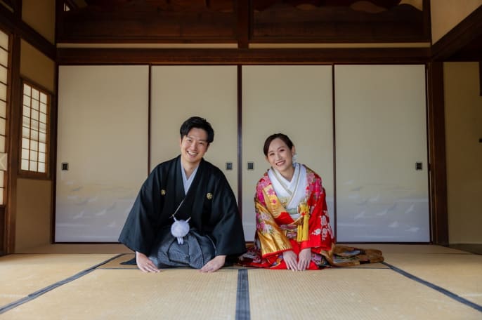 グリーンやゴールドを取り入れた落ち着いたコーデに合わせて、ヘアメイクもきれいめに。新郎様の上下黒の装いも加わり、和室によく映えました。さわやかな秋晴れの下、開放感のあるとても気持ちのいい日で、明るい雰囲気の写真がご希望だったので、身体を動かしながら楽しく撮影させていただきました。