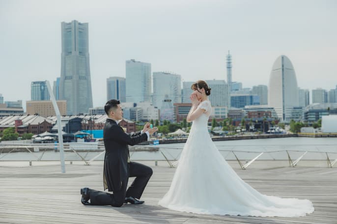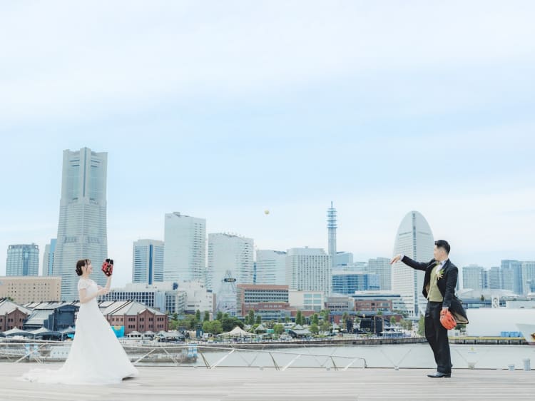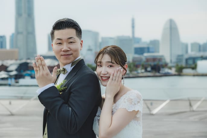 【横浜で記念日】汽笛が二人のスタートを祝う横浜のロケーションで美しい一枚を