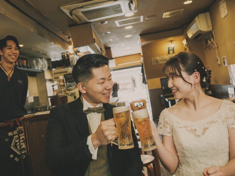 お酒が好きなおふたりは、 新郎様のご友人が営む 横浜・野毛の居酒屋を舞台に撮影。 営業時間外の撮影協力のもと、 飾らない素の笑顔を写真に。