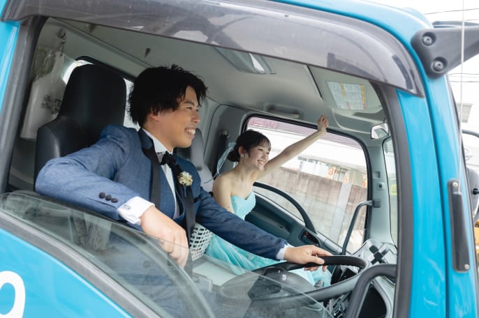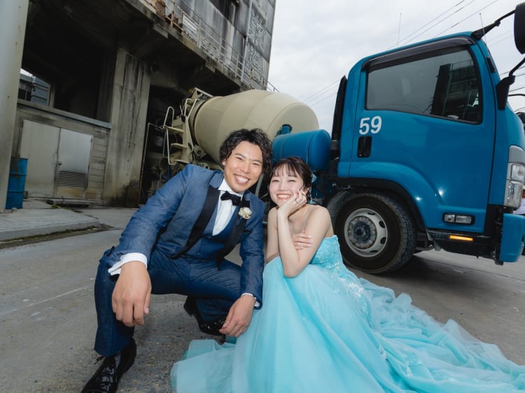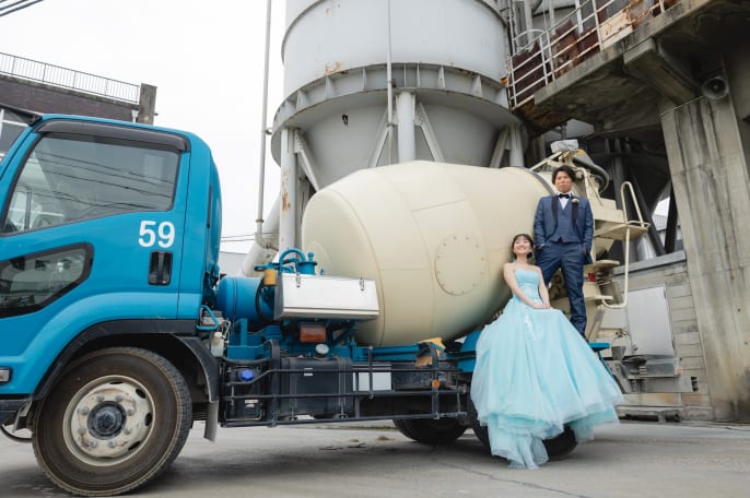 おふたりの記念日にあわせての撮影は、 出会いのきっかけとなった ミキサー車のある工場で。