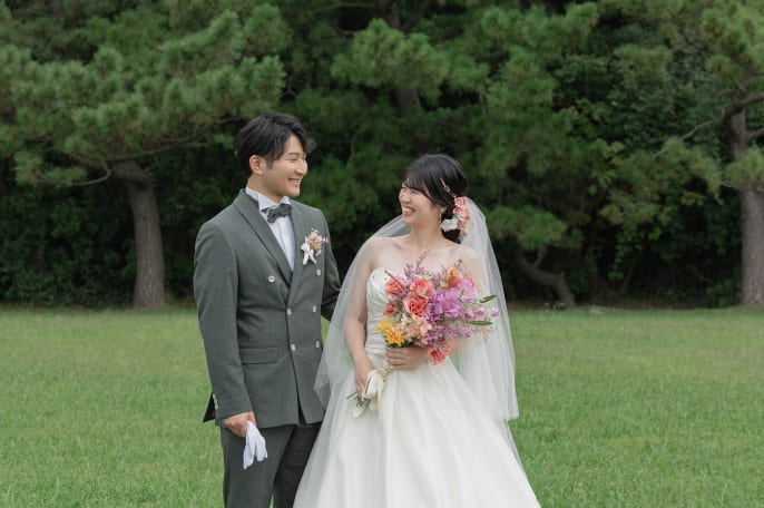 新婦様はたくさんのお花をつけた編み下ろしヘアに、ピンクメイクで可愛らしく。ブーケもピンクで揃え、海と緑に映えるコーディネートでした。撮影中にいろんなお話をして、おふたりと共通点があったり、写真を見返しながら新郎様のフォームがきれいだと盛り上がったり、終始楽しい時間でした。