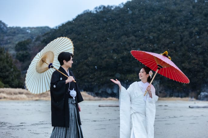 河津桜との撮影を選んだおふたり。 当日3箇所を巡る中で、 天気はくもりから晴れ、日中はなんと雪が降り、 この日この場所でしか撮影できない、 海での雪撮影にも挑戦。