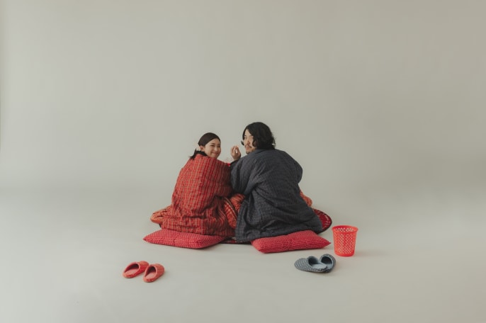 シンプル背景+アレンジもできる ハウススタジオに決定し、 メインアイテム「こたつ」に合わせて 衣装や小物をコーディネート。