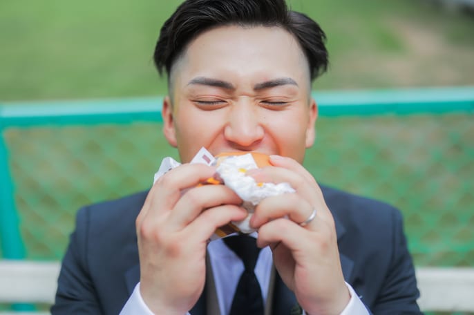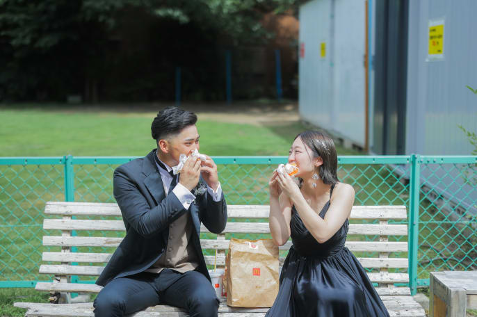 相談会でドレスに目を輝かせていた新婦様と、その姿を優しく見守る新郎様の様子が印象的でした。ヘアはベースを活かしてカジュアルに、カラードレスにあえてベールを合わせました。途中でハンバーガーを購入し、実際に食べていただきながらの撮影も、楽しんでいただけて嬉しかったです。