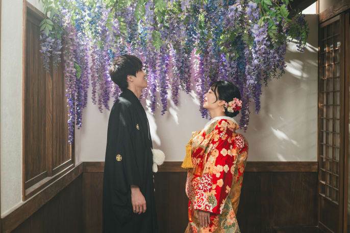 白無垢と色打掛の2着で臨んだ、 屋内庭園スタジオでの撮影。