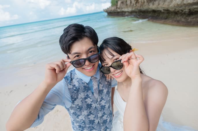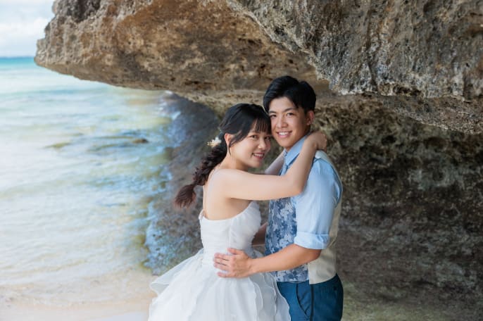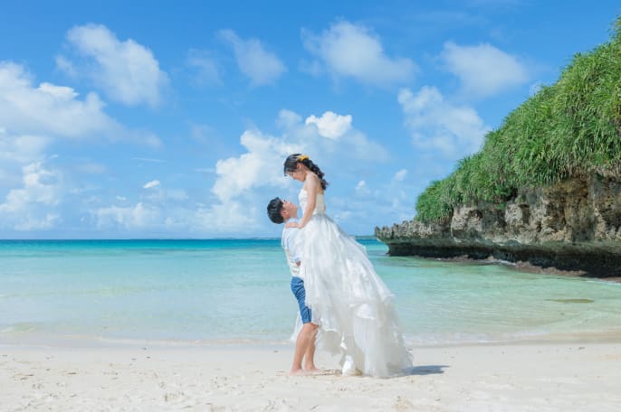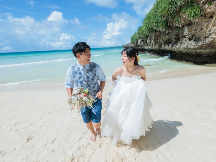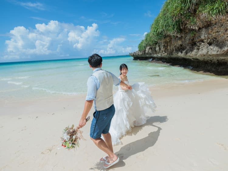当日は見事な晴天に恵まれ、 透き通る宮古ブルーと おふたりの笑顔が交わって、 心はずむ一日の記録を形にしました。