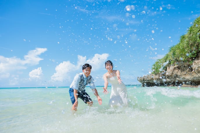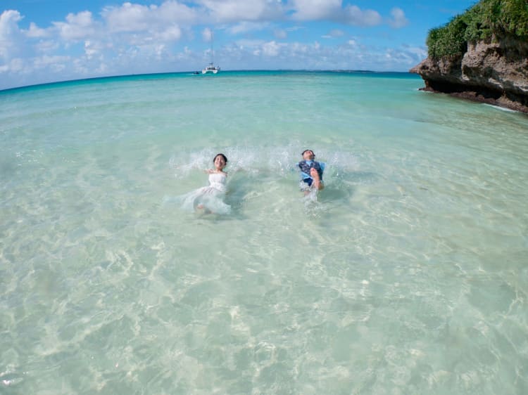 「宮古島のきれいな海に入りたい!」と楽しみにしてきてくださったおふたりで、一緒に腰までビーチに浸かりながら撮影しました。当日はおふたりの想いが伝わり、天気も味方してくれました。以前から憧れておられたダイブ撮影を、最高のコンディションのもとで実現でき本当によかったです。