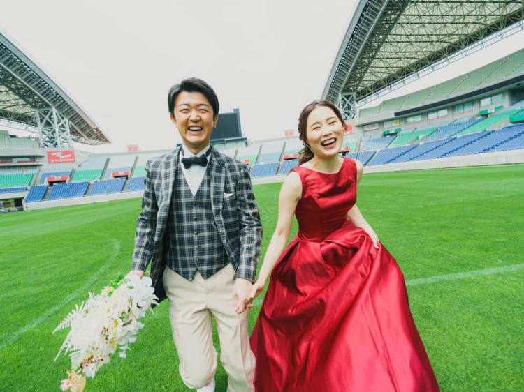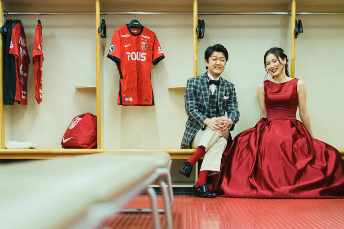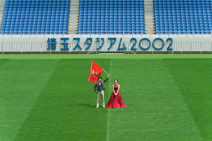 共通の趣味がサッカーで 浦和レッズのサポーターというおふたりは 埼玉スタジアムでのロケーション撮影。