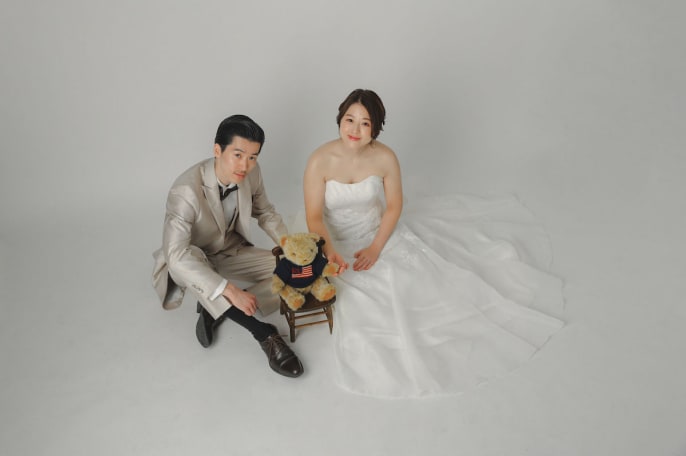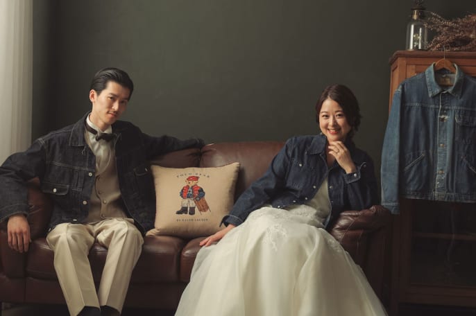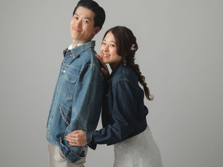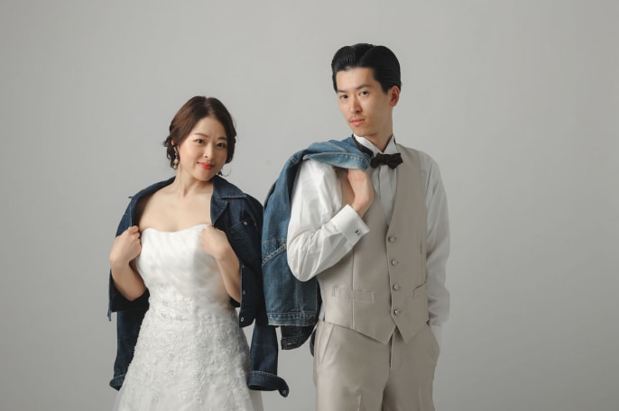 とても表情豊かなおふたりで、カメラに向けてくださる表情も素敵だったので、空気感を大事に撮影を進めました。ジャケットに合わせてヴィンテージ感のある背景を選んだり、トレンドの韓国フォトも意識したりしながら撮影しました。撮影後には「楽しくて大満足でした」と仰っていただけました。