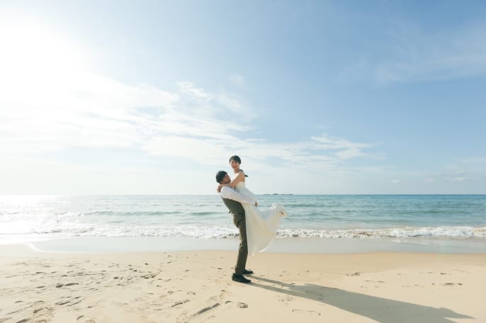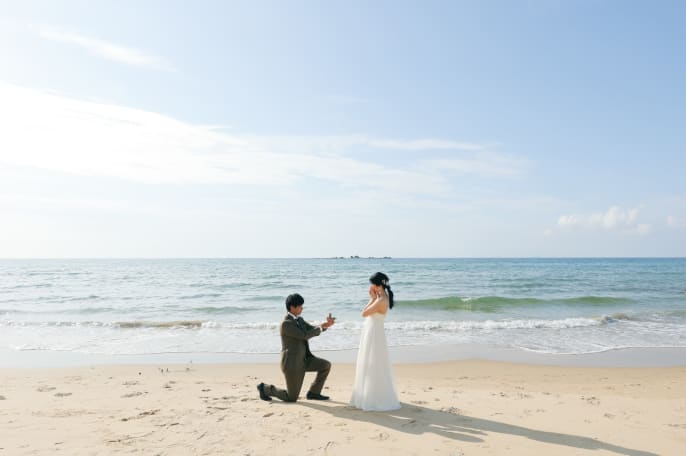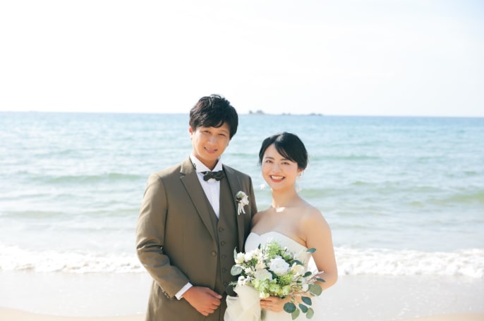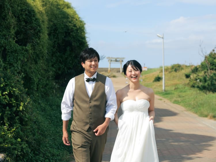 新郎様が九州のご出身で、旅行を兼ねて 「福岡のきれいな海で撮影したい」 とご希望のおふたり。
