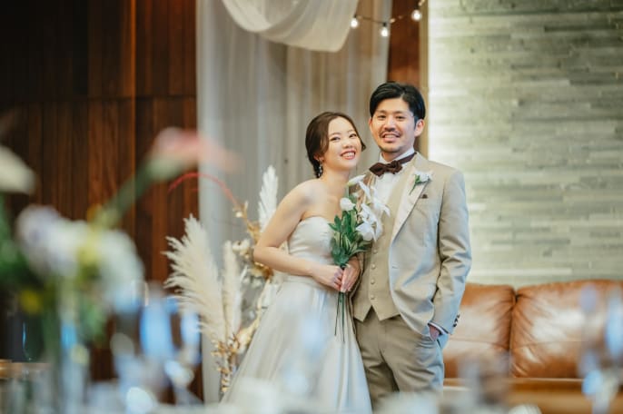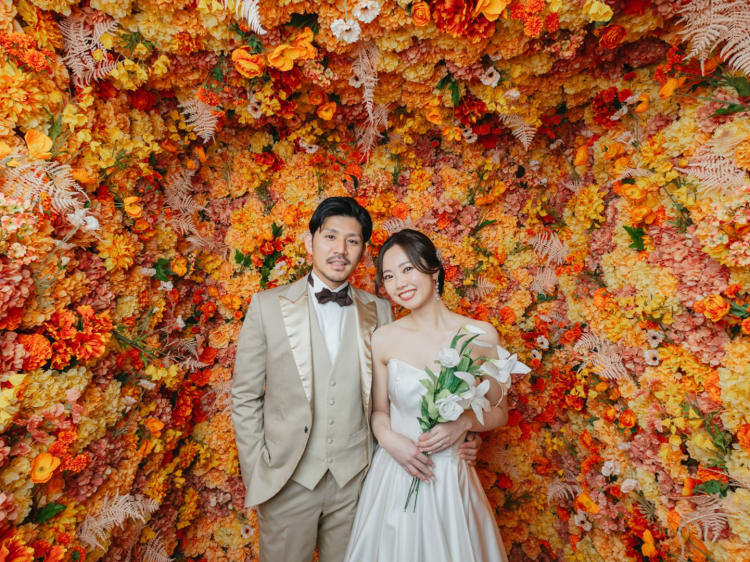 スタジオのフラワーウォールで、 チャペルと雰囲気のがらっと異なる写真も。