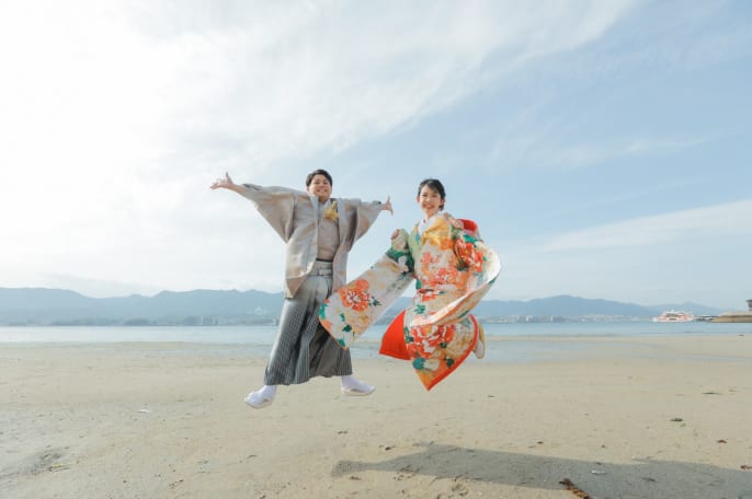 結婚の記念にフォトウェディングを選んだおふたり。 「広島らしい景色の中で撮りたい」と 宮島でロケーション撮影をすることに。