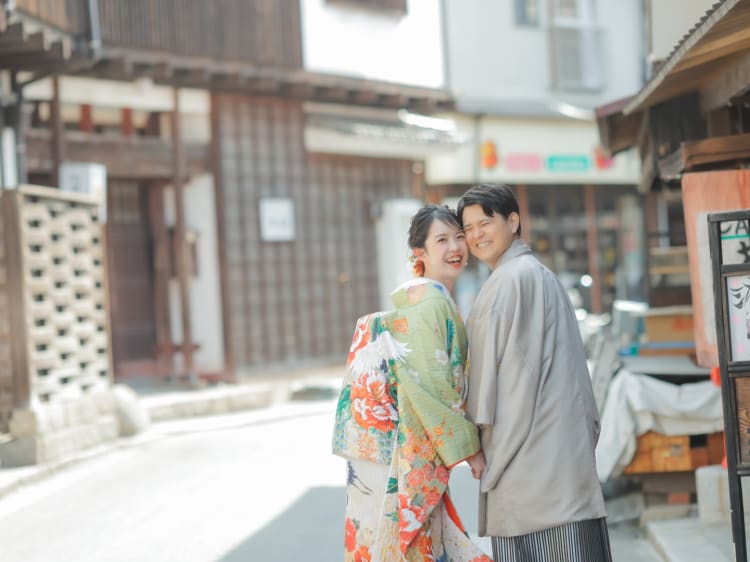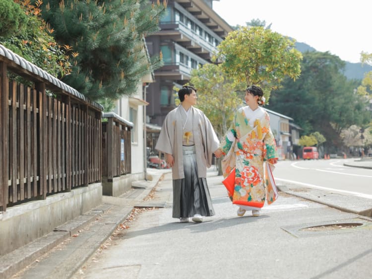 コーディネートやヘアメイクは、新婦様のやわらかい雰囲気や着物の華やかさに合うように、トータルバランスを意識してご提案しました。天気も良く、観光気分で歩きながら、常にお話ししていただきながら撮影を進め、仲良しなおふたり空気感をそのまま写真に収めました。