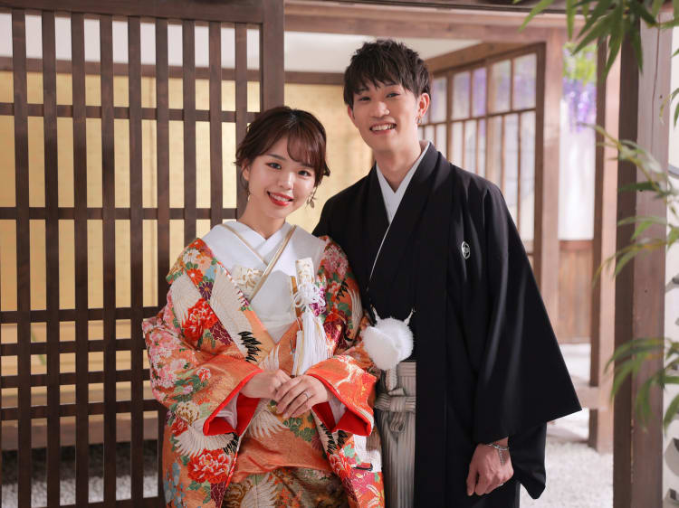 和装撮影で屋内庭園スタジオを選んだおふたり。 衣装合わせでは複数の衣装を羽織り、 指名したヘアメイクスタッフと相談しながら 雰囲気に合って肌写りの良い色打掛に決定。