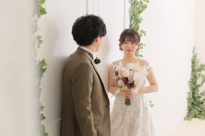 チャペルスタジオでは挙式風シーン、 ハウススタジオではカジュアルフォトと、 スタジオ×衣装×小物の工夫でがらっと雰囲気の異なる バリエーション豊富な写真を残しました。