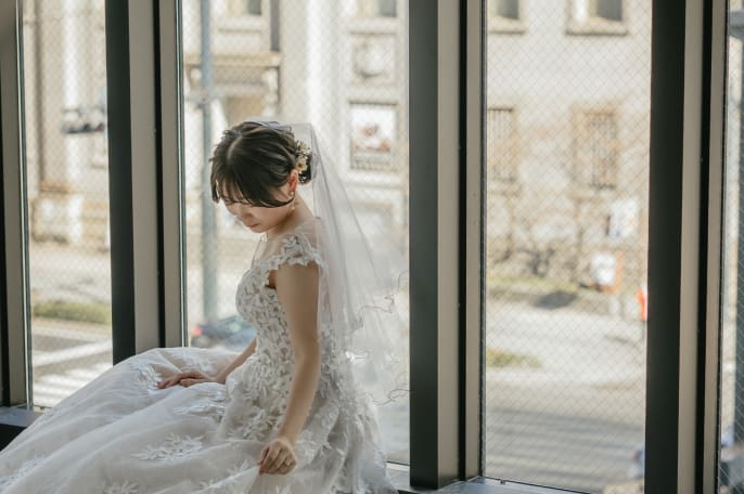チャペルスタジオでは、ベールを付けていただき神聖なイメージをメインで撮影しました。スタジオの大きな窓からは歴史の残る広島の街並みが見渡せるのでおすすめのスポットで、天気が良かったので窓際での撮影も行いました。