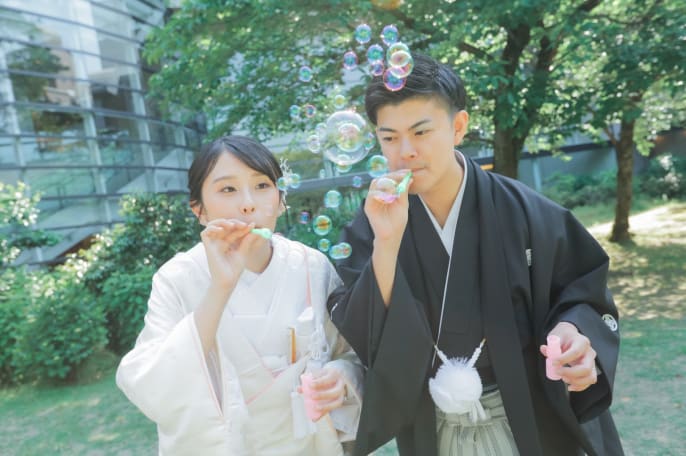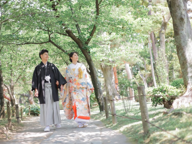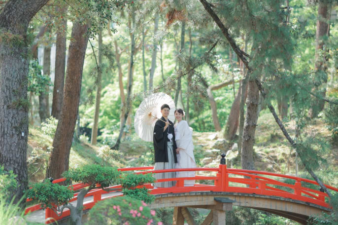 衣装がよく映える緑がきれいな庭園で、 色打掛と白無垢2着での撮影を叶え 笑顔フォトをたくさん残しました。