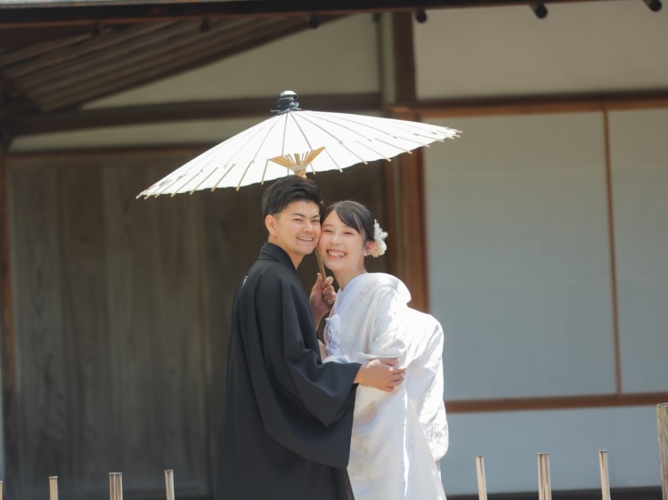 ヘアはタイトにすっきりまとめ、メイクは色打掛に合わせてオレンジ系で仕上げ。撮影日は良く晴れて暑い日だったので、日陰と日向を活かしながら撮影を進めました。色打掛と白無垢それぞれの衣装が映えそうな背景を探し、提案しながら撮影を行いました。終始明るいおふたりで、とても楽しい撮影でした。