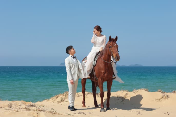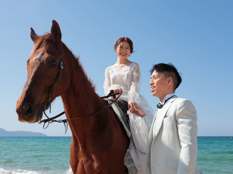天気にも恵まれ、青空と美しい海を背景に 馬と一緒での撮影が叶って 幸せいっぱいの一日に。