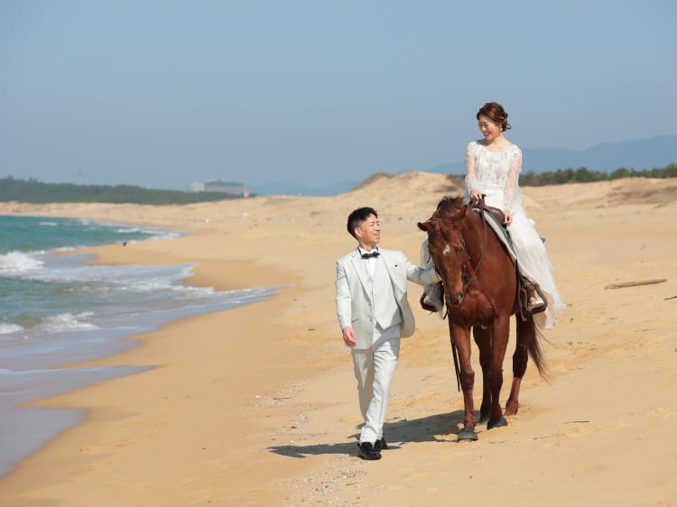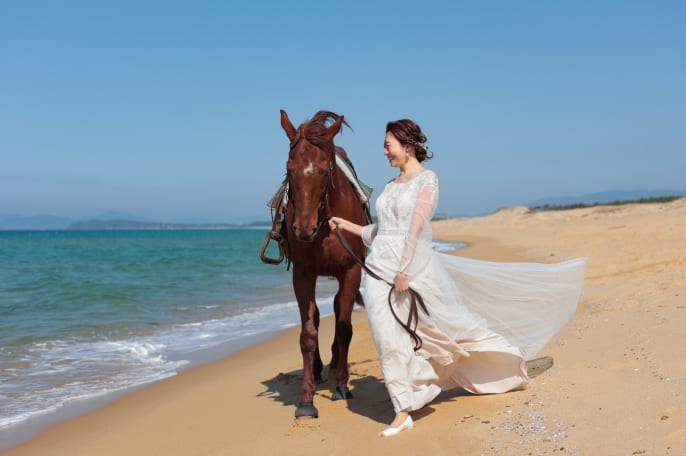 新婦様が馬が大好きとのことで 「福岡で乗馬しながら撮影したい」と 撮影場所を求めて来店されたおふたり。