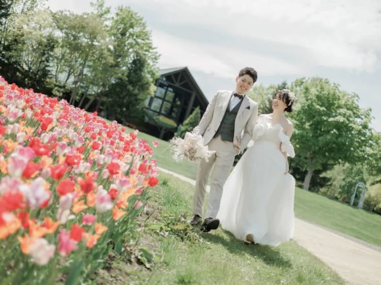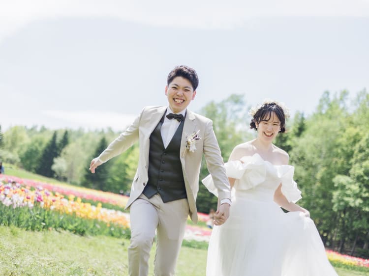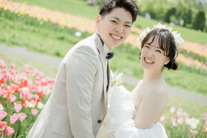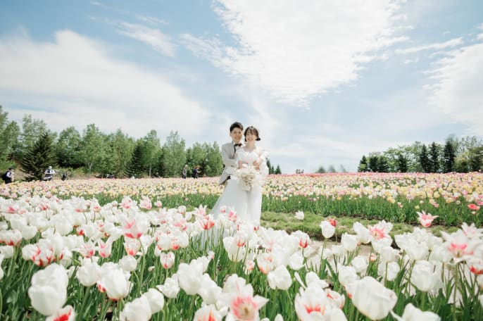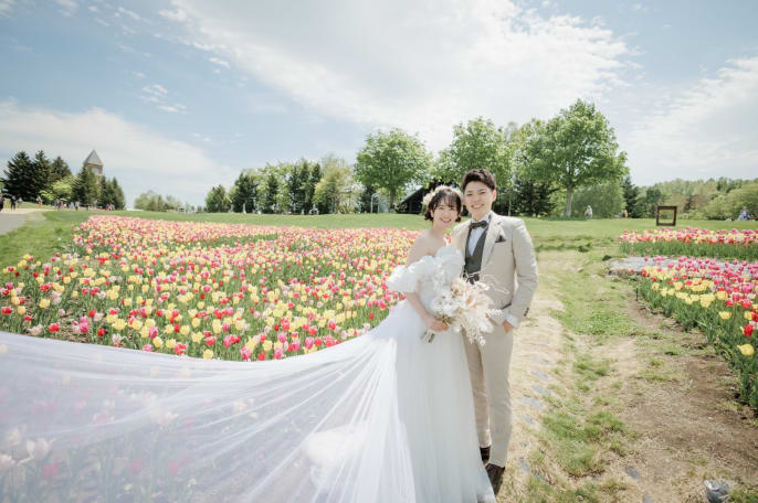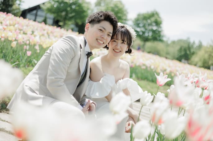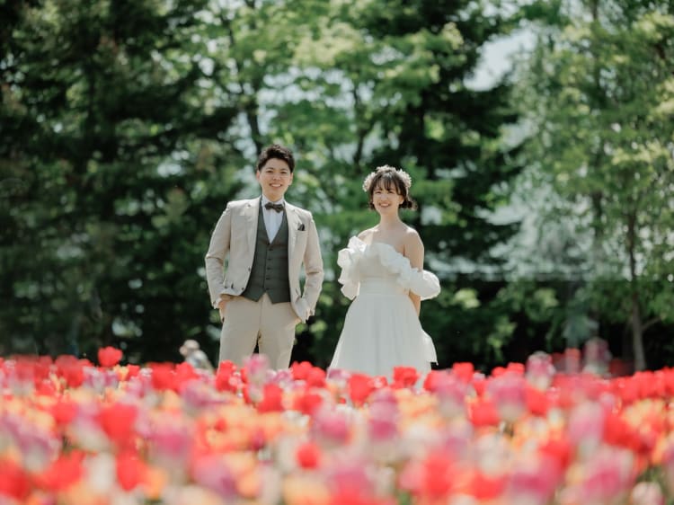 来店時は撮影場所に悩んでいたおふたり。 チューリップ畑の写真を見て一目惚れし、 滝野すずらん丘陵公園での春のお花畑ロケーションに決定。