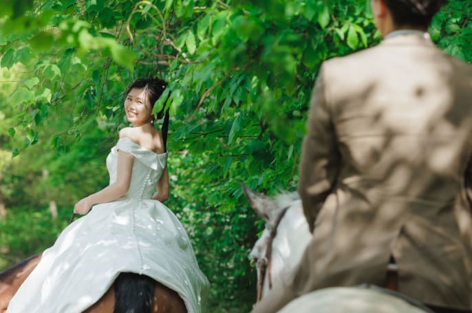 ボリュームのある純白ドレスに、華やかなアップスタイルが乗馬撮影にぴったりでした。特別な一日がまるごと思い出になるように、出発前から乗馬後までの一日すべてを撮影させていただきました。とても仲が良く優しい雰囲気が印象的で、素敵なおふたりの撮影を担当できて本当に良かったです。