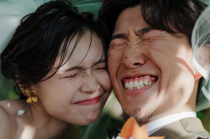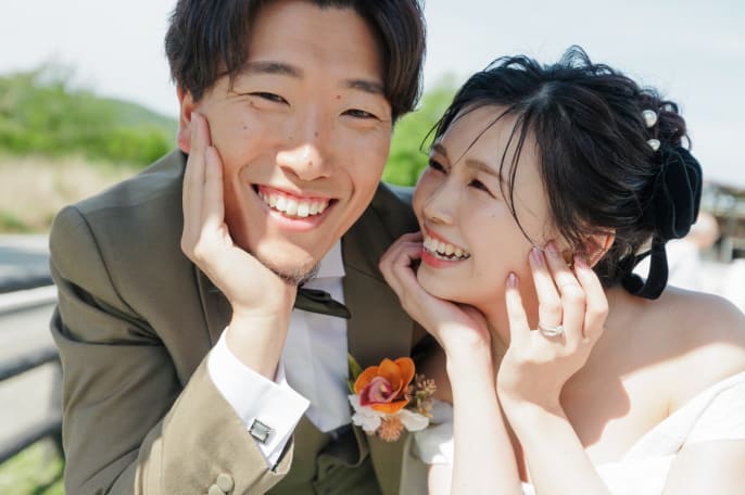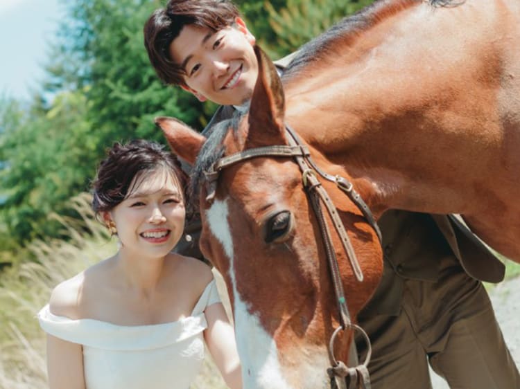 常ににこにこ笑顔のおふたりは 馬とも仲良くなって、顔を並べての写真も実現。 思い出に残る大満足の一日に。