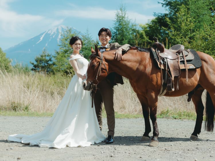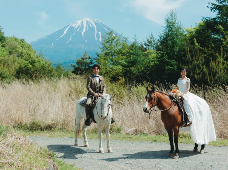 「富士山と撮影したい」というご希望で来店されたおふたり。 プランナーの提案で、乗馬しながらの撮影も行うことに。