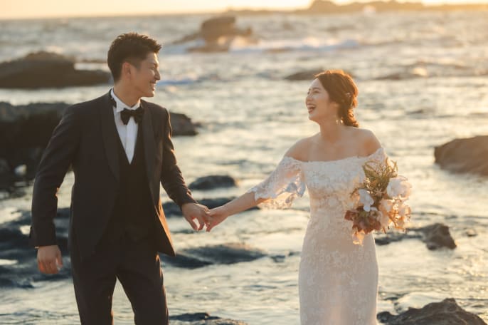 新郎様のご親戚が以前に撮影されており、 ご紹介で来店されたおふたり。 相談会で写真を見ながらロケ地を検討し、 話題のスポット城ヶ島の写真を見て「ここがいい!」と決定。