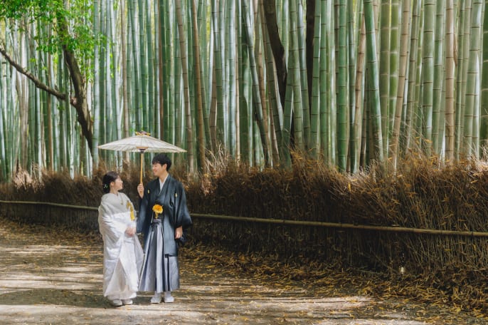 九州にお住まいのおふたりが選んだのは、新緑の季節の京都での後撮り。圓光寺では壮大な庭園や茶室の風景を楽しみ、嵐山では風情ある屋形船に乗ったり、道中ではお団子を味わったりと、観光気分を味わいながら撮影。