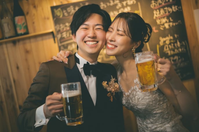 ロケーション撮影をご希望だったおふたり。相談会でお話しするうちに、行きつけのお店を中心とした思い出の詰まった場所で撮影する、ふたりだけのオリジナルプランが誕生。当日は実際にお酒を飲みながら、店員さんも