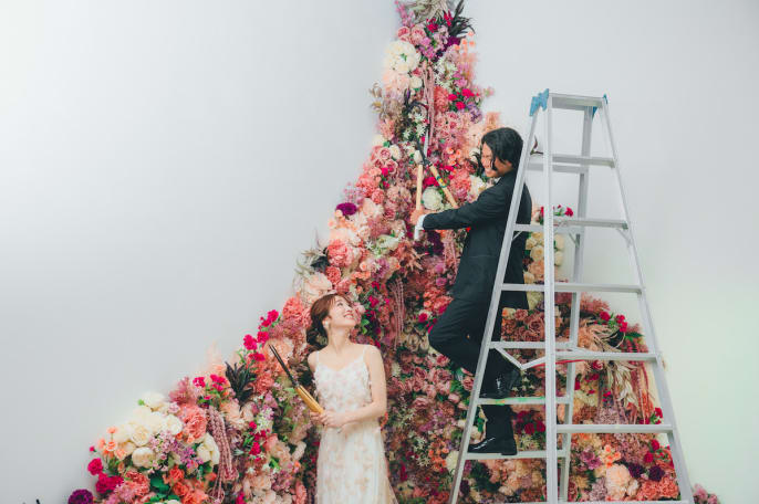 ジャイアントフラワーに惹かれてスタジオを訪れたおふたり。ハートバルーンやサングラスなど可愛らしいアイテムを持ち込んで、ポップで愛らしい世界観を演出。撮影は終始和やかなムードで、スタジオ背景もめいっぱい