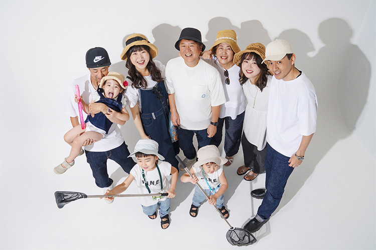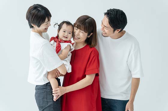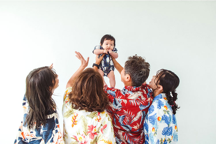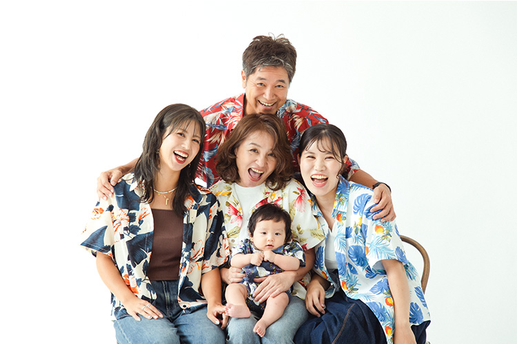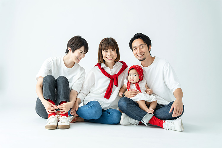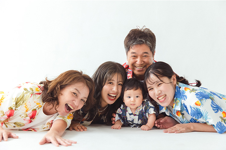 お孫さんを囲んで、自然とみんなの顔がほころびます。いつもの家族の空気感をそのまま写した、愛情溢れる一枚に。