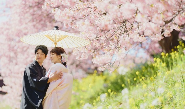 桜の季節だけの特別な景色を背景に、色鮮やかなウェディングフォトを。