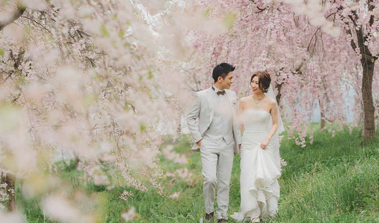 桜の季節だけの特別な景色を背景に、色鮮やかなウェディングフォトを。