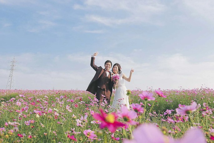 名古屋の市街地から少しはなれた場所にある、庄内緑地公園。自然と撮影をしたい新郎新婦さまに人気のロケーションです。広い園内には、池や芝生広場、噴水などがあるほか、秋はコスモスやバラといった花との撮影も楽しめます。