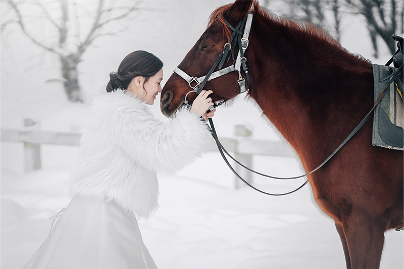 純白のパノラマを独り占め「丘のまち」として知られる美瑛。冬になると一面の銀世界が広がります。大自然の幻想的な空間で、映画のワンシーンのような撮影が叶います!さらに美瑛では、犬ぞり体験や馬と一緒に撮影できる特別なプランもご用意。北海道ならではの貴重な体験をお楽しみください。