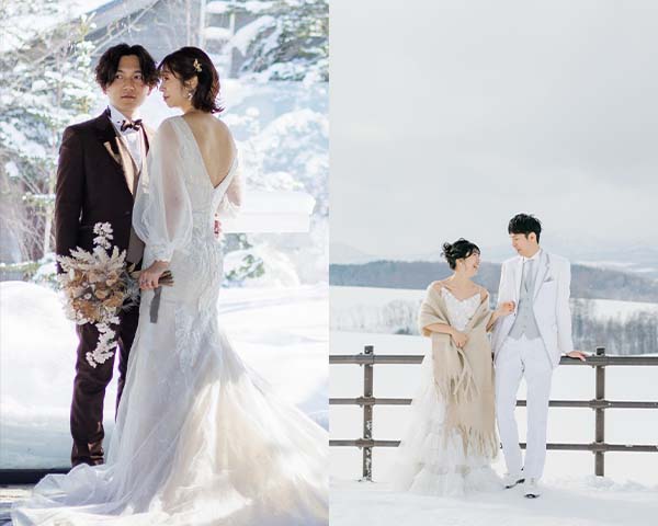 真っ白な雪を背景に、憧れのウェディングドレスや伝統的な着物もお好きな衣装で撮影いただけます。