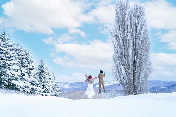 北海道を代表する魅力的な風景がたくさんある美瑛町。真っ白で幻想的な雪とともに、のびのびとおふたりらしい写真が残せます。
