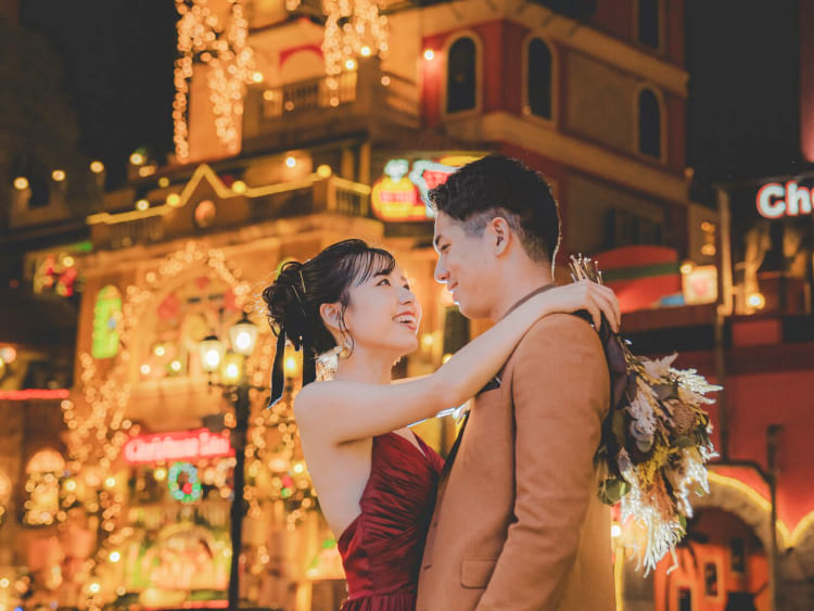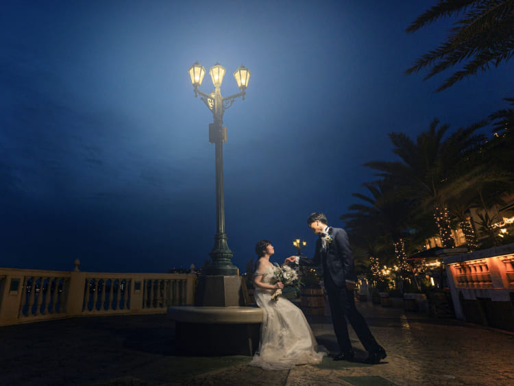 街灯が灯る、冬の宵ヤシの木に絡むイルミネーション静かな夜の街で、ふたりだけの時間が流れる光と影が織りなす特別なナイトフォト
