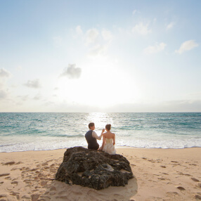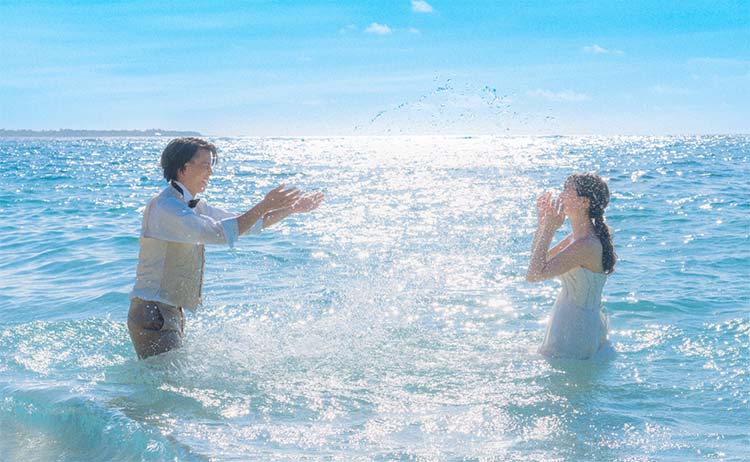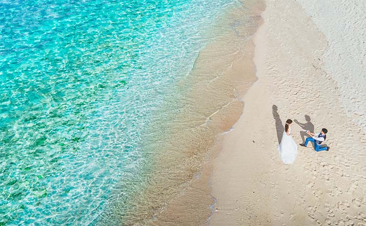 世界屈指の透明度を誇る美しい海で有名な宮古島。「宮古ブルー」と言われる、エメラルドグリーンやコバルトブルーの海と、雪のように白い砂浜で、ここでしか撮れないフォトジェニックなウェディングフォトが残せます。