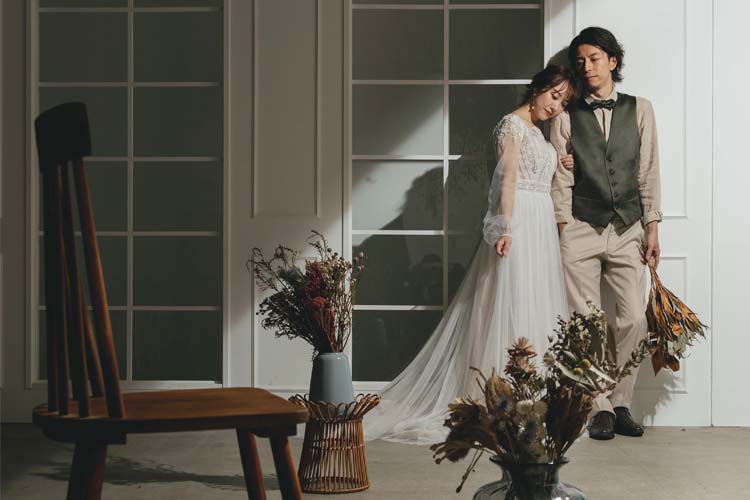 時代に左右されない「正統派の婚礼写真」を撮影します。背景がシンプルだからこそ、お二人の表情や衣装の美しさが際立つ一枚に仕上がります。