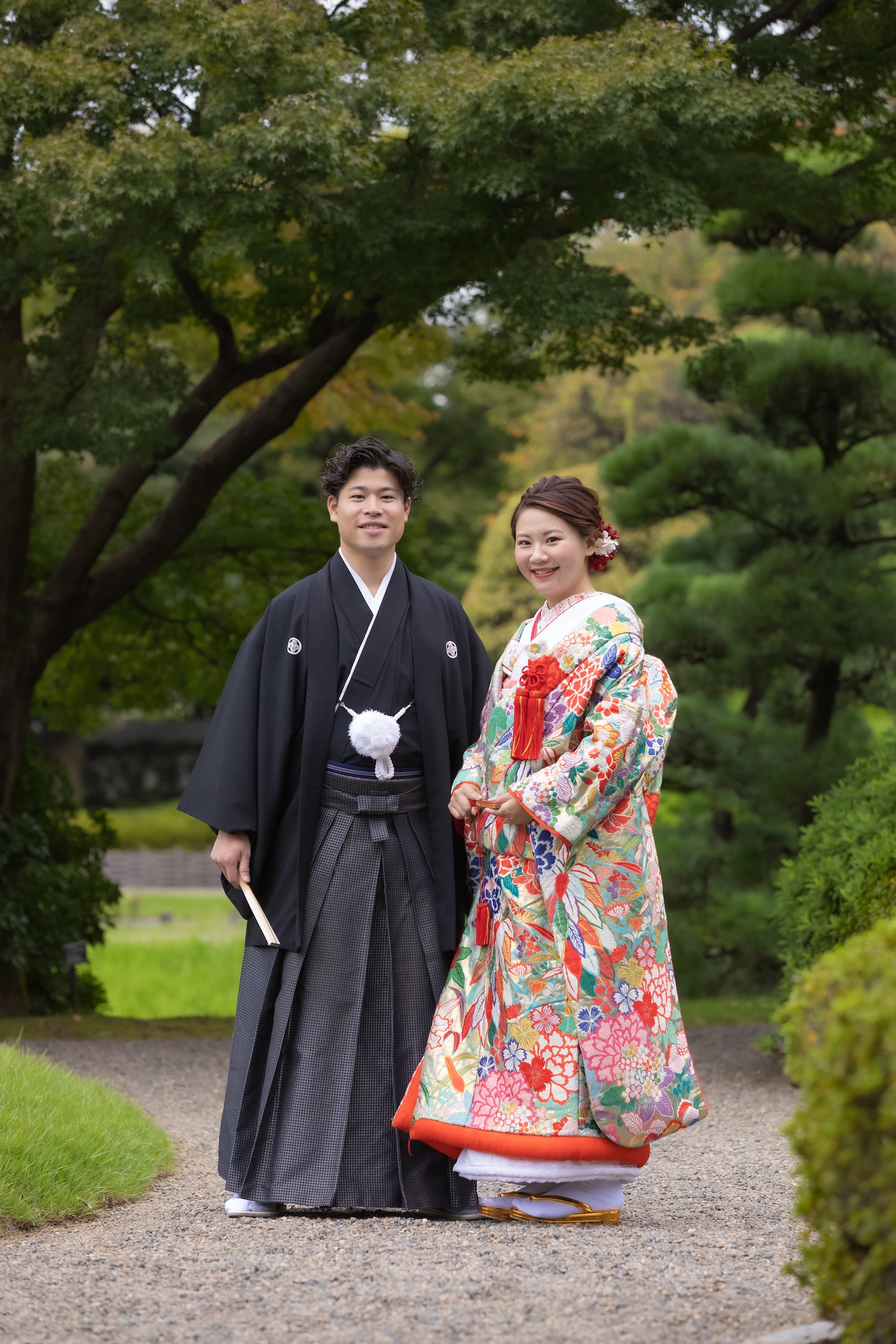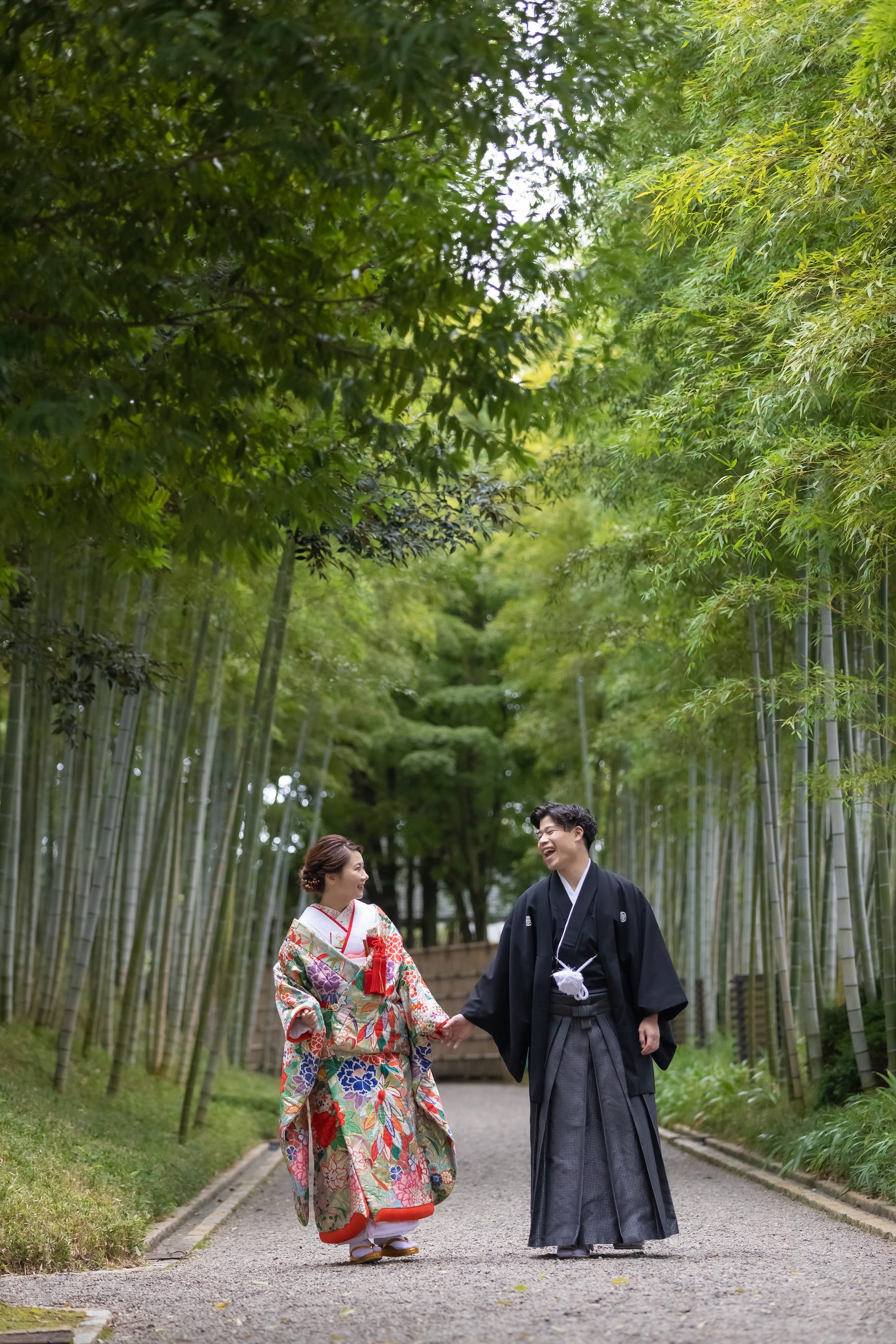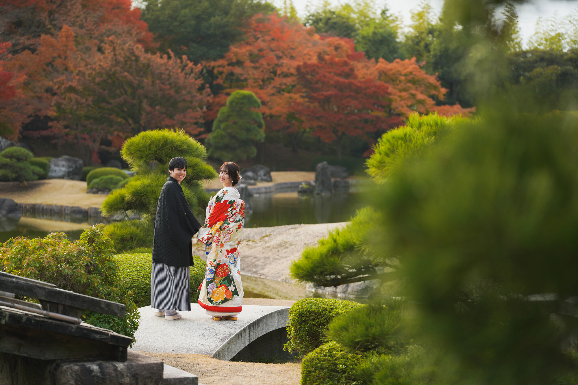 敷地面積21,290m2の日本文化の伝統を備えた重みのある廻遊式池泉庭園で、苑内には茶室や木橋及び築山などを備えています。また、埼玉県で唯一の屋外能舞台を持つ「こしがや能楽堂」が隣接しており、日本文化の美と四季折々の風情を楽しむことができます。桜や紅葉では東京から前撮り・フォトウェディングの撮影にくる方も多い撮影場所です。
