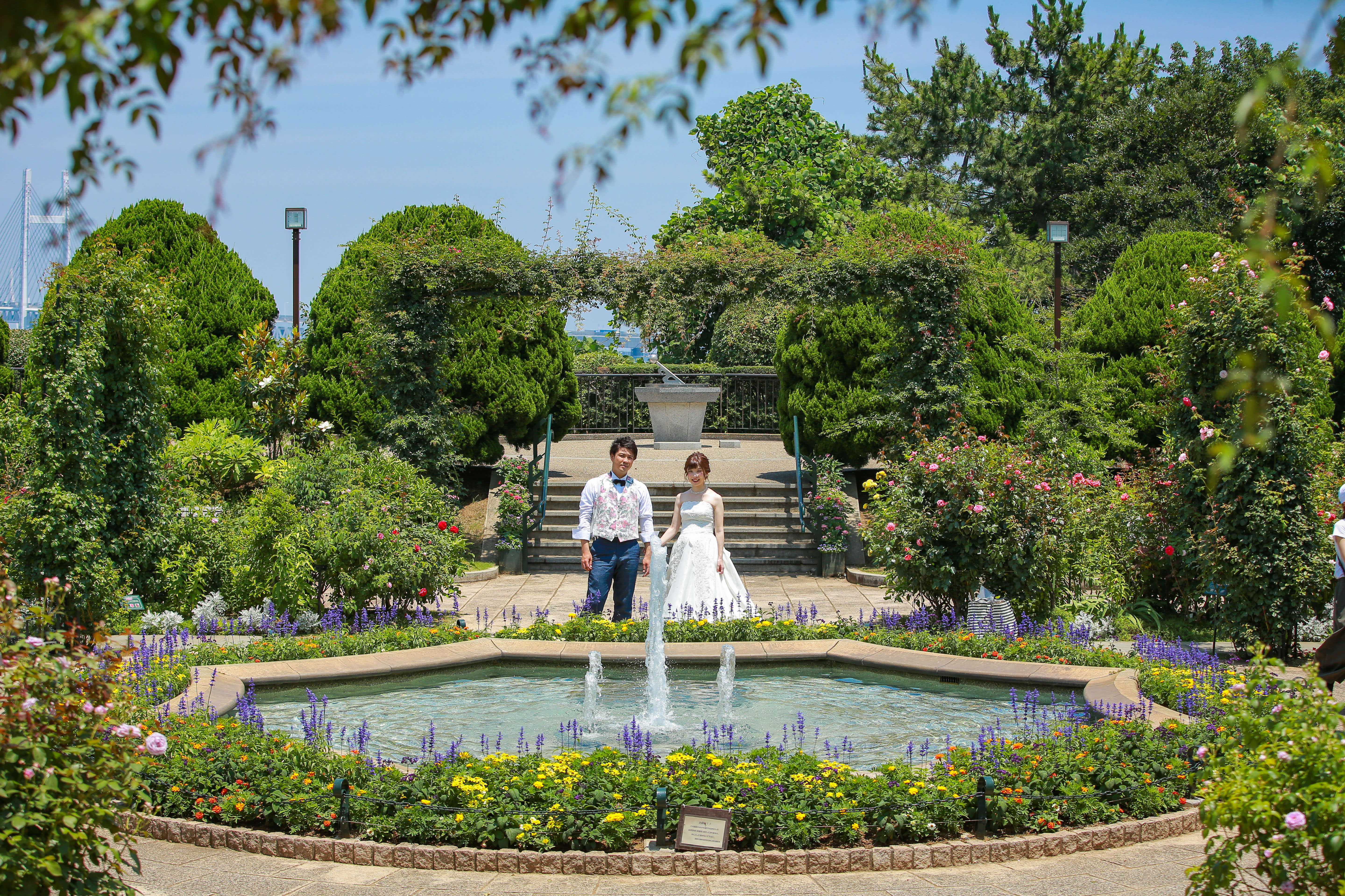 港の見える丘公園はその名の通り、横浜港を見下ろせる高台にある公園。横浜のシンボルの一つである、横浜ベイブリッジや東京湾を一望できる見晴らしのよい場所です。また、港の見える丘公園は、横浜市の花に制定されているバラの名所としても有名。その数は約110種、約1300株と、種類も花の数も豊富です。2016年には緑化工事が完了し、元々あったバラ園は「イングリッシュローズの庭」としてリニューアルオープンしました。バラの見頃は年に2回あり、5月中旬〜6月中旬、10月中旬〜11月中旬にきれいに咲き誇る様子を楽しむことができます。