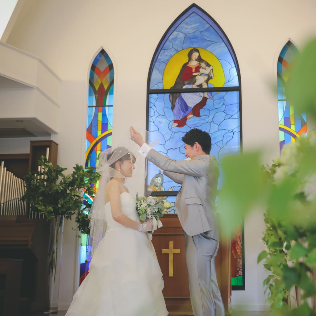 ベールアップや指輪交換といった、結婚式と同じ流れでフォトウェディングを行うこともできるため、結婚式を行わないお二人にもおすすめのロケーションです。ご家族を招待して行うことも、もちろん可能。チャペル内と屋外で、異なる雰囲気の結婚写真を残すことができます。