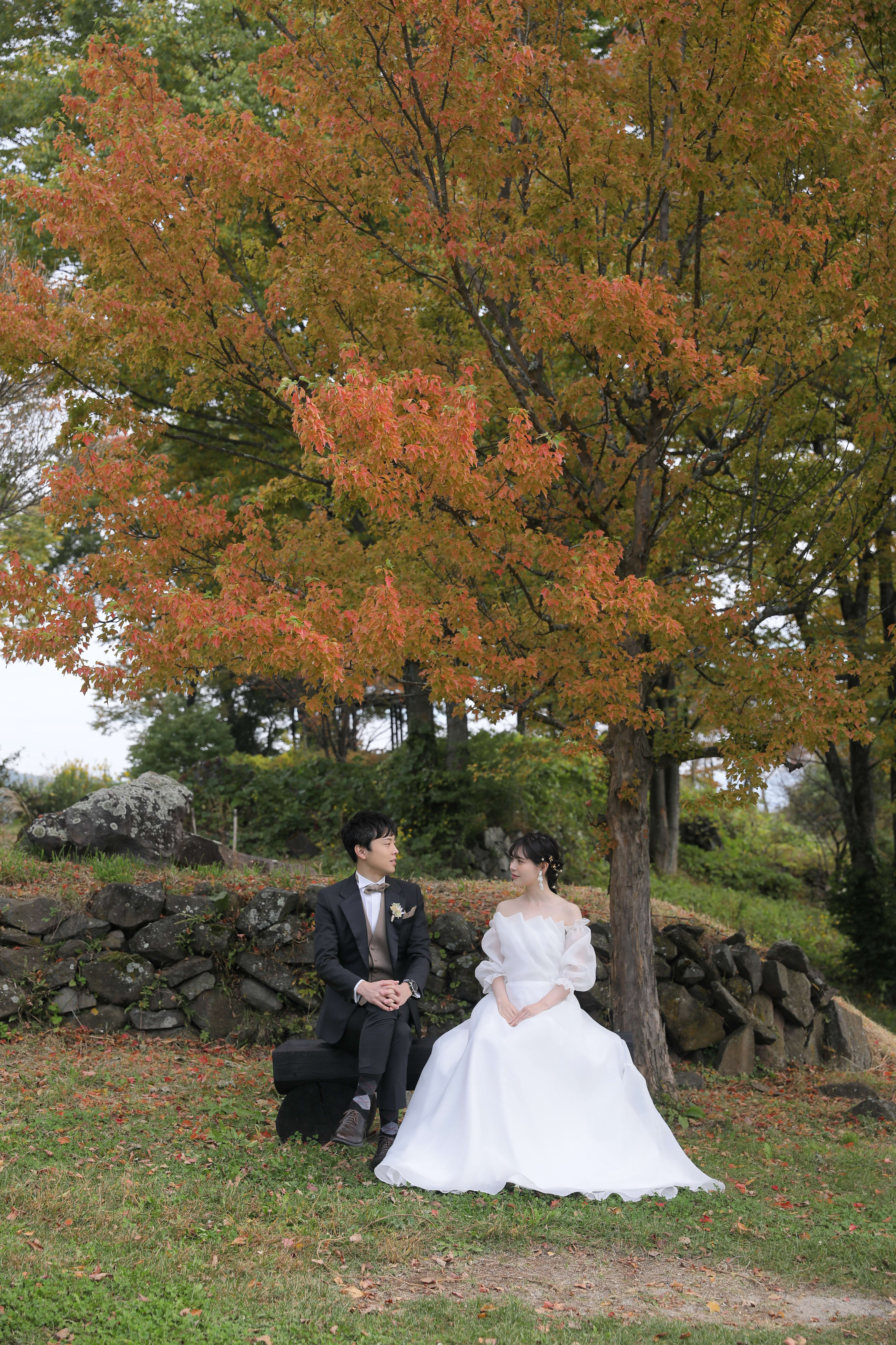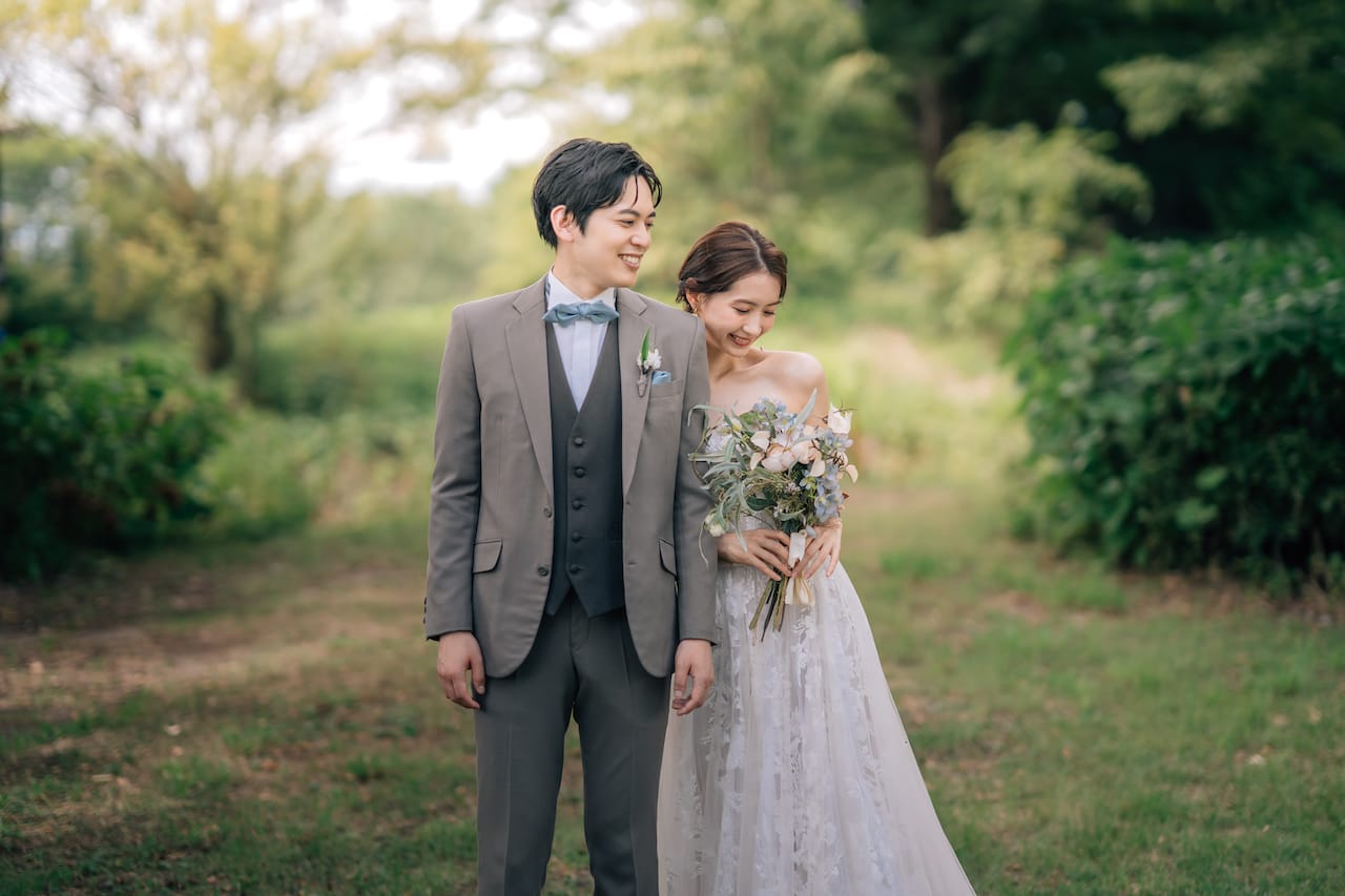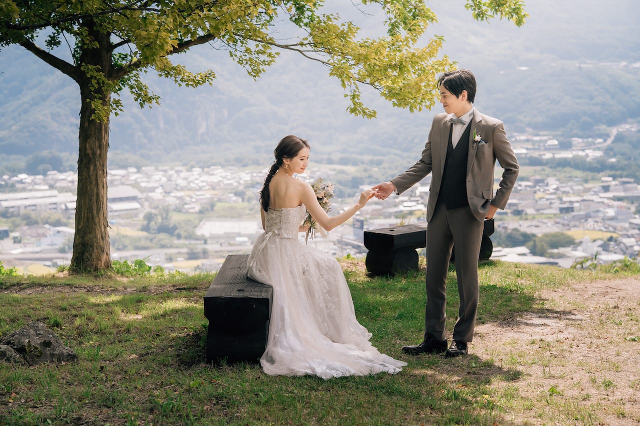 飯綱山公園は高台からの眺めが美しい、大パノラマが広がるスポット。長野らしい雄大な自然に囲まれながら、ナチュラルなウェディングフォト撮影をすることができます。