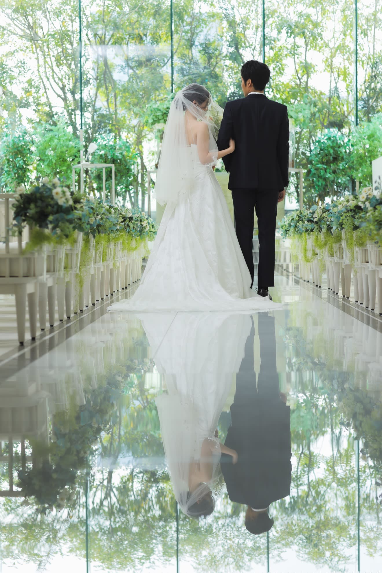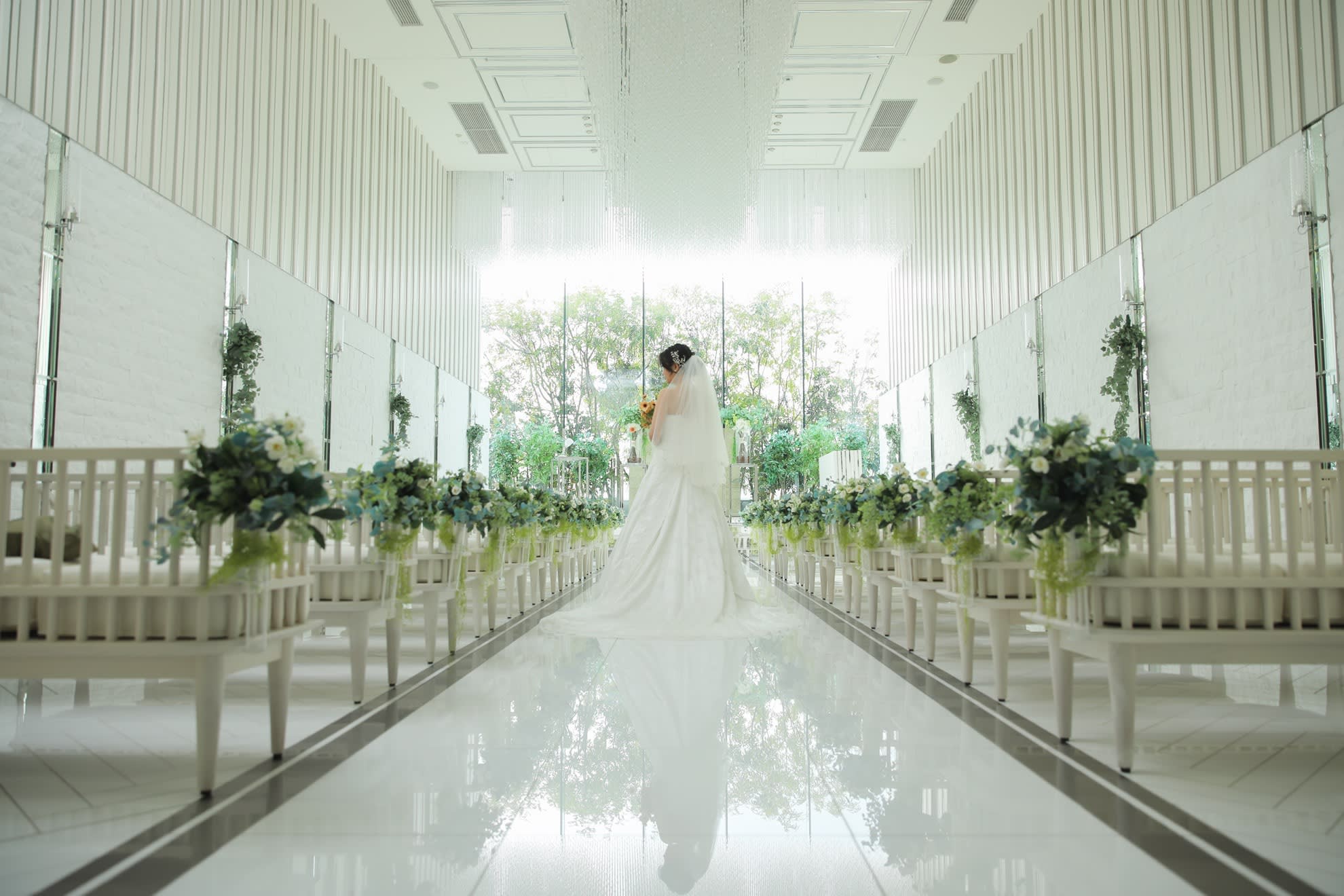 5万個のクリスタルが煌めく全長18mのバージンロードは、感謝の想いを伝えるに相応しい長さを誇る。